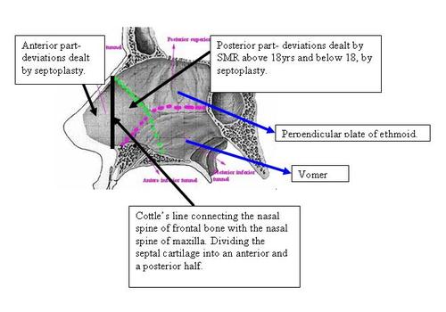 Anterior septal cartilaginous deviations are dealt with septoplasty and posterior septal cartilaginous are dealt by septoplsty ,if less than 18 years...since the posterior cartilaginous septum contains a growth center that contiues to grow till the age of 18years..hence if this is resected below this age, it will lead to developmental hypoplasia of the entire mid third of the face. Above the age of 18 years, the posterior cartilaginous septum can safely be resected and hence therfore SMR is performed.